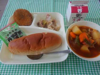 <牛乳 黒糖パン チキンレバーカツ ケチャップ煮 たことキャベツのバジルソテー やわらか黒豆>