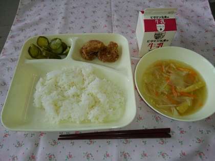 <牛乳 ごはん 豚肉の香味揚げ すまし汁 あっさりきゅうり>