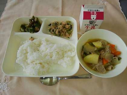 <牛乳 ごはん 豚肉とじゃがいもの煮もの オクラの梅風味 ツナっ葉いため>