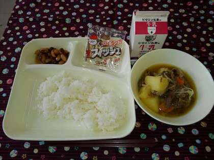 <牛乳 ごはん 肉じゃが とら豆の煮もの アーモンドフィッシュ>
