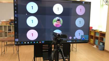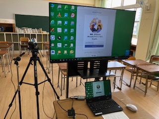 Teamsの会議室を作る先生と、それに参加する児童が同じ学校の回線を通して行ったためか、半分くらいのパソコンが固まってしまいましたが、残ったパソコンからは先生の発問が聞こえ、板書の文字も見ることができました。