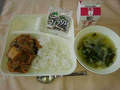 <牛乳 マーボーあつあげ丼(ごはん) 中華スープ ミニフィッシュ>