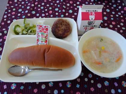 <牛乳 黒糖パン 焼きハンバーグ 豆乳スープ キャベツとピーマンのソテー>