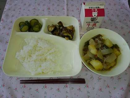 <牛乳 ごはん 肉じゃが 焼きなすのみそだれかけ あっさりきゅうり>