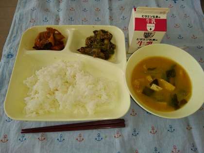 <牛乳 ごはん 鶏肉のてり焼き みそ汁 なすのそぼろいため>