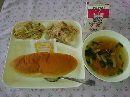 <牛乳 大型コッペパン 鶏肉のからあげ とうがんの中華スープ 切干しだいこんのごま辛みづけ マーマレード>