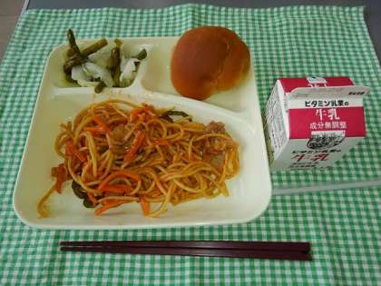 <牛乳 1/2パン イタリアンスパゲッティ グリーンアスパラガスとキャベツのサラダ>
