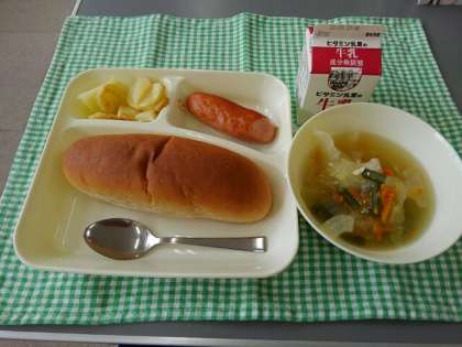 <牛乳 黒糖パン フランクフルトのケチャップソース スープ 焼きじゃが>