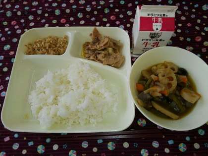 <牛乳 ごはん 豚肉のねぎじょうゆ焼き ふきよせ煮 ツナ大豆そぼろ>