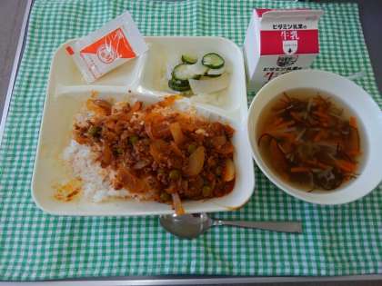 <牛乳 タコライス もずくのスープ じゃがいもときゅうりのサラダ(ノンエッグドレッシング)>