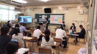 遠隔授業後の研究会では、今里小と南港桜小との交流学習の成果や課題などを話し合いました。
