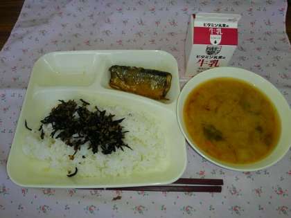 <牛乳 ごはん さんまのみぞれかけ みそ汁 牛ひじきそぼろ>