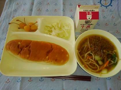 <牛乳 おさつパン タンタンめん キャベツの甘酢づけ さくらんぼ(缶)>