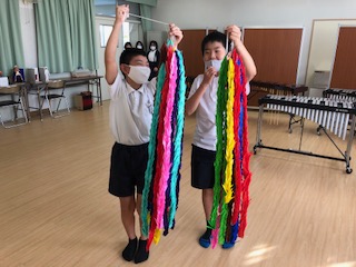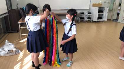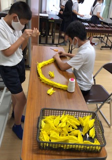 修学旅行に向けて、今里小学校のみんなが折ってくれた千羽鶴を6年生が繋ぎました。