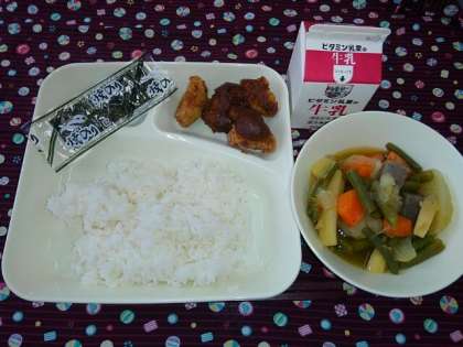 <牛乳 ごはん みそカツ じゃがいもと野菜の煮もの 焼きのり>