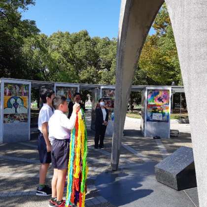 千羽鶴を捧げ、平和への祈りをこめて平和の鐘をならしました。