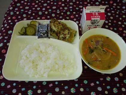 <牛乳 ごはん お好み焼き 豚汁 きゅうりの梅風味>