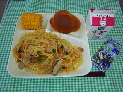 <牛乳 1/2黒糖パン ウインナーときのこのしょうゆ風味スパゲッティ 焼きとうもろこし>