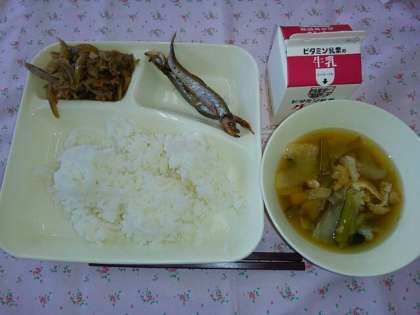 <牛乳 ごはん 焼きししゃも 五目汁 きんぴらごぼう>