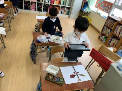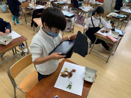 全校遠足で拾ってきた落ち葉や木の実をならべて、見えたものをタブレットで撮影しました。