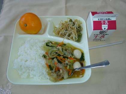 <牛乳 中華丼 もやしとさんどまめの中華あえ みかん>