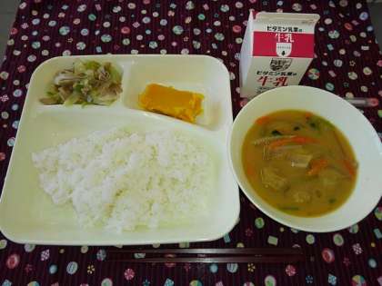 <牛乳 ごはん 豚肉とまいたけのいためもの つみれ汁 かぼちゃういろう>