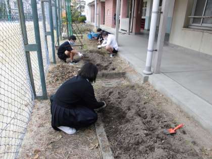 ヘチマ・ゴーヤのつるのかたづけからはじめて3週間。土を耕してならしたあと、レンゲとクローバーの種をまきました。