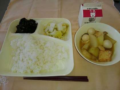 <牛乳 ごはん 関東煮 白菜の甘酢あえ のりのつくだ煮>