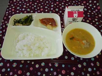<牛乳 ごはん あかうおのしょうゆだれかけ みそ汁 こまつなのいためもの>