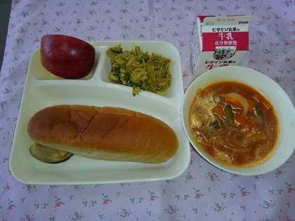 <牛乳 黒糖パン 豚肉のカレー風味焼き ケチャップ煮 りんご>