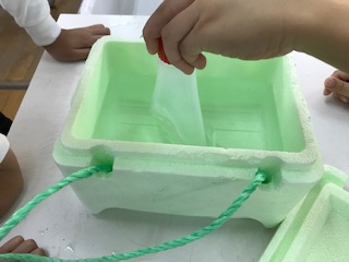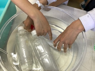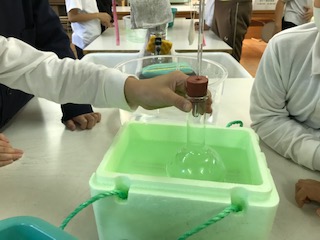 ガラス管にゼリーを入れて氷水につけるとあっという間にゼリーは下がっていきました。そのあとお湯につけると、ゼリーは飛び出していきました!みんなゼリーの動きにびっくり!!