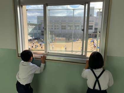 音楽室の帰り、二階の窓から5.6年生のフラッグの演技が見えました。あまりに綺麗だったので少し観賞しました。