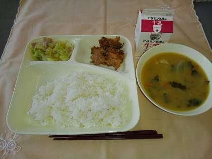 <牛乳 ごはん 豚肉のごまだれ焼き なめこのみそ汁 キャベツのいためもの>
