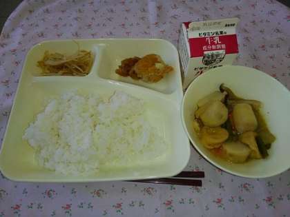 <牛乳 ごはん あげどりのねぎだれかけ 含め煮 もやしのピリ辛あえ>