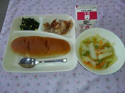 <牛乳 黒糖パン 豚肉のガーリック焼き スープ ほうれんそうのソテー>