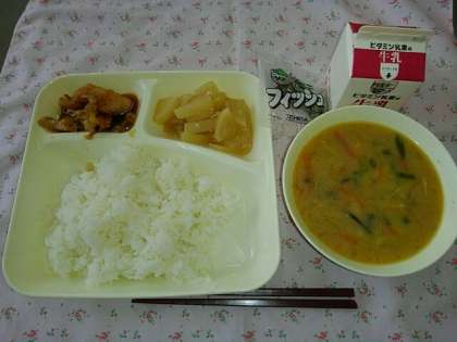 <牛乳 ごはん 鶏肉の甘辛焼き みそ汁 だいこんの煮もの ミニフィッシュ>