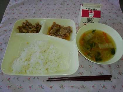 <牛乳 ごはん 豚肉のねぎしょうゆ焼き すまし汁 れんこんのおかかいため>