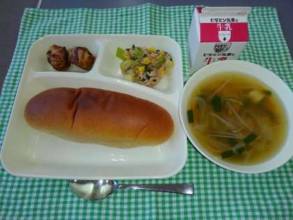 <牛乳 黒糖パン あげシューマイ とうふのスープ ツナとチンゲンサイのいためもの>