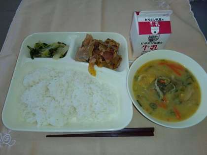 <牛乳 ごはん 豚肉のしょうが焼き さつまいものみそ汁 きくなとはくさいのごまあえ>