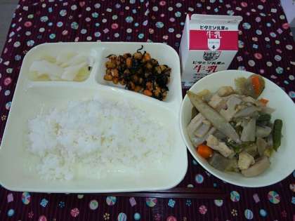 <牛乳 ごはん 筑前煮 ひじき豆 だいこんのゆず風味>