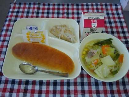 <牛乳 大型コッペパン あじのレモンマリネ てぼ豆のスープ煮 固形チーズ マーマレード>