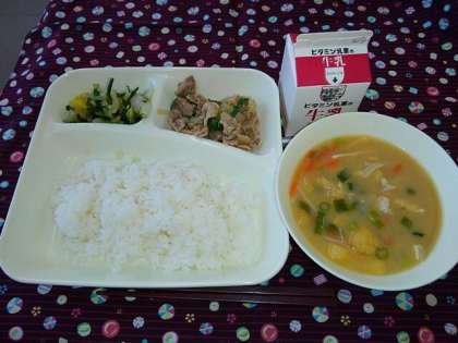 <牛乳 ごはん 豚肉のごまだれ焼き みそ汁 きくなとはくさいのおひたし>