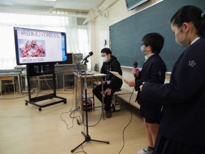 調理員さんへ感謝のお手紙をわたした後、5年の司会進行で6年から給食についての発表をしました。