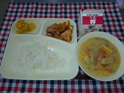 <牛乳 ごはん 鶏肉の甘辛焼き かす汁 くりきんとん>