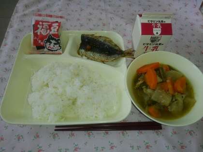 <牛乳 ごはん いわしのしょうがじょうゆかけ 含め煮 いり大豆>