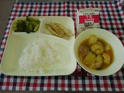 <牛乳 ごはん きびなごてんぷら 一口がんもとじゃがいもの煮もの ブロッコリーのごまあえ>