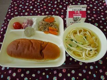 <牛乳 黒糖パン 豚肉とごぼうの煮もの なにわうどん プチトマト>