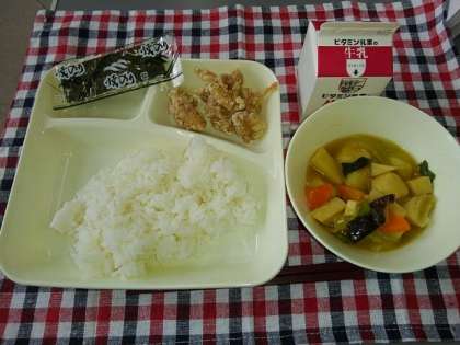 <牛乳 鶏肉のからあげ まる天と野菜のうま煮 焼きのり>