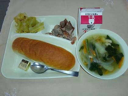 <牛乳 パン 豚肉のガーリック焼き スープ サワーソテー バター>