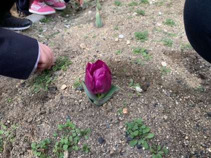 みんなで見にいってみると、本当に咲いていました!先週の暖かさで茎が伸びる前に咲いてしまったようです。とても、可愛いチューリップです。